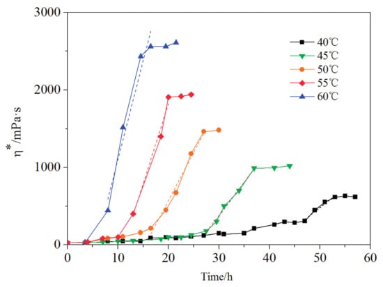 The crosslinking reaction process of the polymer gels was characterized by complex viscosity with an angular frequency of 0.1 Hz. Different stages of the crosslinking reaction were identified. In order to characterize the crosslinking reaction, a line was drawn to fit the rapidly increasing complex viscosity. Tg is defined as the value when this line is extended to the time axis, as the intersect on the x axis in the fitting equation. The crosslinking reaction process of 0.3% YG100 + 0.6% resorcinol + 0.4% HMTA (pH = 5.5) system is shown in Figure 3.