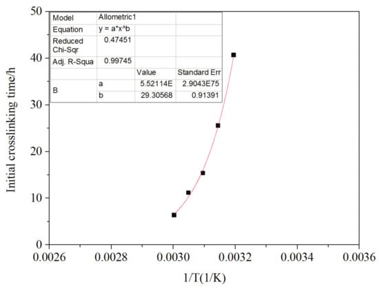 From Figure 12 and Figure 13, a higher temperature results in a shorter induction period, faster reaction rate, and higher complex viscosity during the stable period. Higher temperature increased the amount of activated molecule, the irregular motion of molecules and the possibility of effective collision, which resulted in more crosslinking points. Therefore, the crosslinking induction period was shortened and the complex viscosity was increased. The relationship between temperature and initial crosslinking time is obtained as Tg = 5.52(1/T)29.31.