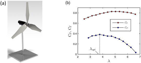 Figure 1. (a) Schematic figure of the miniature wind turbine placed in the turbulent boundary layer. (b) Variation of C T and C P with the tip-speed ratio λ for the miniature turbine placed in the boundary layer with u ¯ h = 5 ms - 1 .
