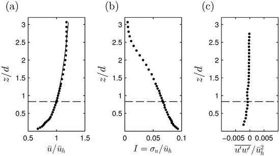 In addition, a high-resolution S-PIV system from LaVision was employed to measure the three velocity components in planes normal to the incoming flow (i.e., y z planes, where y and z denote the lateral and vertical directions, respectively). A 400 mJ dual-head Nd:Yag laser together with two 16-bit sCMOS cameras (2560 × 2160 pixels) was used to capture the wake flow in field of views (FOVs) with the size of 3 d × 2 d and the spatial resolution of 0.023 d . The mean velocity field was obtained by ensemble averaging 1200 instantaneous velocity fields, and the data were sampled with a frequency of 10 Hz. Velocity measurements were performed for the incoming flow as well as the wake of the turbine operating at the optimal tip-speed ratio ( λ o p t 3.8 ). Figure 2c shows the profile of the vertical turbulent momentum flux u w ¯ normalized with u ¯ h 2 for the incoming boundary layer flow. PIV data of the turbine wake will be discussed in detail in Section 4.