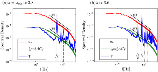 Recent works (e.g., [34,35]) have shown the potential of using the information related to the wind-turbine performance to provide insights on the incoming-flow characteristics. In order to extend this stream of research, we compare the spectral density of the thrust force T with the one of the incoming flow at hub height, as seen in Figure 3 for two different tip-speed ratios. For the sake of comparison, the spectral density of ( 1 / 2 ) ρ u h 2 A C T , whose mean value is equal to T ¯ , is also plotted in the figure, where A is the rotor area. For each operating condition, thrust measurements were performed over a period of 60 s with a sampling frequency of 15 kHz. As shown in the figure, the thrust spectral density closely matches the one of ( 1 / 2 ) ρ u h 2 A C T at very low frequencies. As low-frequency scales contain most of the turbulent kinetic energy of a turbulent flow, this matching can be employed as a useful technique to estimate incoming flow characteristics. It will be of interest to examine this possibility for wind turbines operating in the field, where thrust measurements are more feasible and affordable than time-resolved velocity measurements.