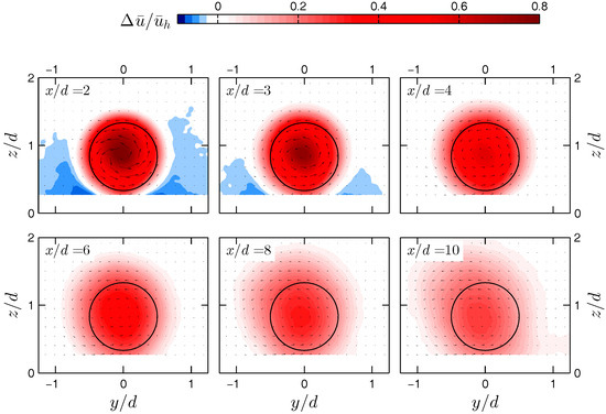 Figure 4. Contours of the normalized velocity deficit Δ u ¯ h / u ¯ h in y z planes at different downstream locations for the miniature turbine operating at λ = λ o . The vector field represents the in-plane velocity components. The black circles show the frontal area of the wind turbine.