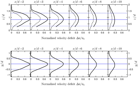 Figure 5. Vertical (top) and lateral (bottom) profiles of the normalized velocity deficit through the hub level at different downstream locations. Solid black lines: new miniature turbine, and dashed black lines: Chamorro and Porté-Agel [10]. Blue solid lines and blue dashed lines represent the rotor axis and the tip positions, respectively.