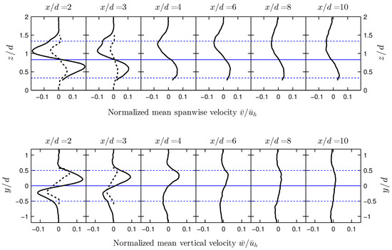 Figure 6. Vertical profiles of the normalized spanwise velocity (top) and lateral profiles of the normalized vertical velocity (bottom) through the hub level at different downstream locations. Solid black lines: new miniature turbine, and dashed black lines: Zhang et al. [11]. Blue solid lines and blue dashed lines represent the rotor axis and the tip positions, respectively.