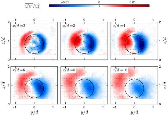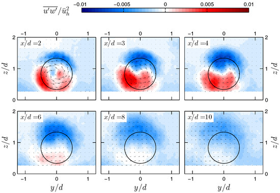 Figure 7. Contours of the normalized vertical momentum turbulent flux u w ¯ / u ¯ h 2 in y z planes at different downstream locations for the miniature turbine operating at λ = λ o . The vector field represents the in-plane velocity components. The black circles show the frontal area of the wind turbine.