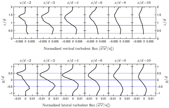 The wake recovery is usually associated with the turbulent momentum flux acting as a mechanism to transfer the energy from the outer flow into the wake. Figure 7 and Figure 8 show contours of the normalized vertical and lateral momentum fluxes (i.e., u w ¯ / u ¯ h 2 and u v ¯ / u ¯ h 2 ), respectively, at different downstream locations. To provide a more quantitative insight on the results, vertical profiles of the normalized vertical turbulent momentum flux as well as lateral profiles of the normalized lateral turbulent momentum flux at hub level are shown in Figure 9. As shown in Figure 7, Figure 8 and Figure 9, the maximum value of momentum turbulent fluxes occurs at around x / d = 3–4, and they both have a non-symmetrical structure which is in agreement with previous studies (e.g., [8]). It is generally believed that the breakdown of tip vortices, which act as a a separating layer between the turbine wake and the outer flow [39], usually occurs at x / d = 3–4. This results in a sudden increase of the flow entrainment at this region [8] . The tilting of turbulent flux distributions is also likely associated with the rotation of the wake [29]. Note also that the negative value of u w ¯ outside the turbine wake shown in Figure 7 is due to the fact that u w ¯ has a negative value in turbulent boundary layer flows over flat surfaces [40], as shown in Figure 2c for the incoming flow. Comparison of the profile of u w ¯ at x / d = 10 seen in Figure 9 with the one of the incoming flow (Figure 2c) shows that the effect of the turbine can be still clearly seen at x / d = 10 .