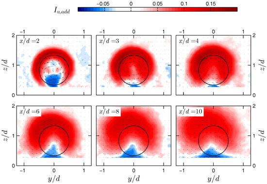 Figure 10. Contours of the added streamwise turbulence intensity I u , a d d in y z planes at different downstream locations for the miniature turbine operating at λ = λ o . The vector field represents the in-plane velocity components. The black circles show the frontal area of the wind turbine.
