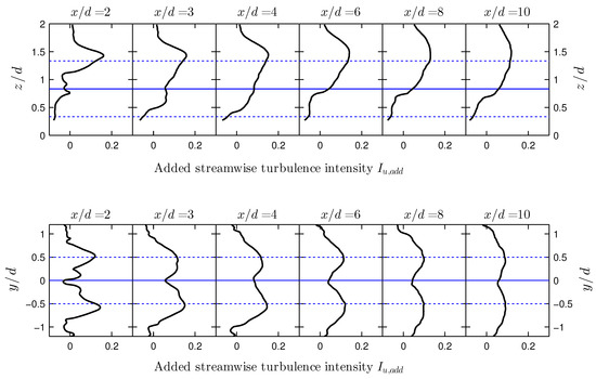 Figure 10 shows the contours of I u , a d d in y z planes at different downstream locations. As seen in the figure, the added streamwise turbulence intensity has a horseshoe shape with the maximum level close to the top-tip level. Moreover, the value of I u , a d d is negative downwind of the turbine bottom tip meaning that the turbine suppresses the turbulence in this region. This can be explained by the reduction of the mean flow shear near the ground [8], and consequently the reduction of the turbulence production in this region. To provide quantitative information on the turbine-induced turbulence, vertical and lateral profiles of I u , a d d at hub level are shown in Figure 11. The high level of added turbulence downwind of the top and the side tips of the rotor is clear in this figure.
