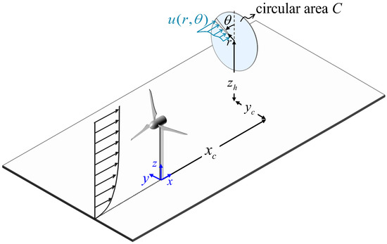 Let us consider the circular area C in a plane normal to the incoming flow (i.e., y z plane) with a diameter equal to the rotor diameter d, as shown in Figure 12. The center of C is located at ( x c , y c , z h ) , where x c and y c are arbitrary streamwise and spanwise positions, respectively, in the wake of the turbine. If a hypothetical turbine rotor is placed at C, the load moment on its blade root is given by