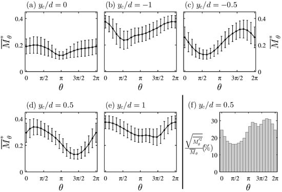 Figure 13a–e shows the variation of M ¯ θ , non-dimensionalized with ρ d u ¯ h 2 , with the azimuthal angle θ . The azimuthal angle θ is zero along the positive z-axis, and it increases towards the positive y-axis. As shown, each figure corresponds to a given y c while the value of x c is the same for all the figures, and it is equal to 6 d , which is in the typical range of turbine spacings in wind farms. Error bars in Figure 13a–e also indicate the value of the standard deviation of the moment M θ 2 ¯ , non-dimensionalized with ρ d u ¯ h 2 .