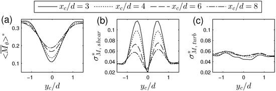 Figure 14a–c shows, respectively, the variation of < M ¯ θ > * = < M ¯ θ > / ρ d u ¯ h 2 , σ M , s h e a r * = < M ¯ θ 2 > / ρ d u ¯ h 2 and σ M , t u r b * = < M θ 2 ¯ > / ρ d u ¯ h 2 with y c for different values of x c . For given x c and y c , < M ¯ θ > * is the normalized time-space-averaged moment over C. The value of σ M , s h e a r * represents moment fluctuations due to mean shear over C. Finally, σ M , t u r b * represents the spatial average of moment fluctuations due to flow turbulent fluctuations.