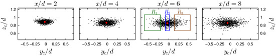 Figure 15. Scatter plot of the instantaneous wake-center position at different downstream locations. The red dots indicate the mean value of the wake-center position at each downstream location. Rectangles R 1 , R 2 and R 3 are used to perform conditional averaging shown in Figure 17.