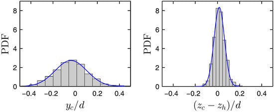 Figure 16. Probability density function (PDF) of the wake-center position in both lateral and vertical directions at x / d = 6 . The blue curves show the fitted normal distributions.