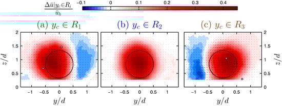 Figure 17. Contours of the conditionally-averaged normalized velocity deficit at x / d = 6 for: (a) y c R 1 , (b) y c R 2 and (c) y c R 3 . The vector field represents conditionally-averaged in-plane velocity components. Black circles indicate the frontal area of the wind turbine. White dots show the approximate position of the counter-rotating vortex pair (CVP).