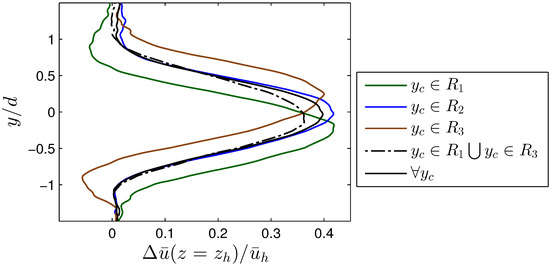Figure 17a,c also shows that when the wake laterally moves to one side, a high-speed region (i.e., region with a negative velocity deficit) appears on the other side. The existence of the high-speed region in these cases can explain why the mean wake cross-section is not stretched laterally despite large lateral meandering motions. This is more evident in Figure 18 showing lateral profiles of the normalized velocity deficit, at hub height, conditionally averaged based on different positions of y c . As seen in the figure, cases with large meandering motions (i.e., y c R 1 and y c R 3 ) reduce the effect of each other on laterally expanding the mean wake cross-section due to the presence of these high-speed regions. In fact, the conditionally-averaged velocity-deficit profile given y c R 1 y c R 3 has the same width as the one corresponding to y c R 2 and also the mean normalized velocity deficit profile without any condition (i.e., y c ). Qualitatively-similar results can be also observed for other streamwise positions although they are not shown here for the sake of brevity.