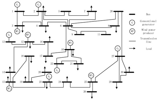 In this section, by implementing the robust MCM mentioned in Section 2, our proposed day-ahead EM modeling approaches under different BMs are simulated on the IEEE 30-bus test system with five strategic WPPs [9]. Matlab R2014a is utilized to conduct our simulations. Figure 1 shows the schematic structure of the test system. Table 1 depicts the predicted single period loads distributed in different buses [42]. Consistent with the assumptions in Section 2, any uncertainties in this test system are not caused by loads. Parameters of conventional generators can be seen in Table 2, and the predicted power output intervals of the five WPPs which are the crucial components of the uncertainty set, are listed in Table 3. For the sake of simplicity and without losing generality, we assume the power output interval of WPPi() predicted by ISO is the same as that predicted by WPPi() itself.