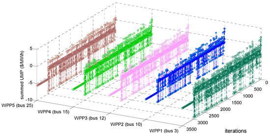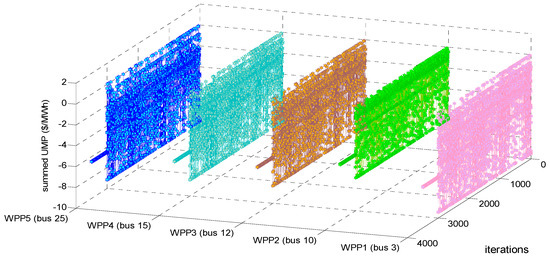 - State variable: in iteration T, the LMP and UMPs in bus m cleared in iteration T − 1 are considered as the market environment states for WPPi connected in bus m (), which is because WPPi () actually has no idea about other market information. Taking to represent the state variable vector for WPPi in iteration T, the relationship between and clearing prices is as follows [20]:where, and represent the LMP and the k-th UMP in bus m cleared in iteration T − 1, respectively.
