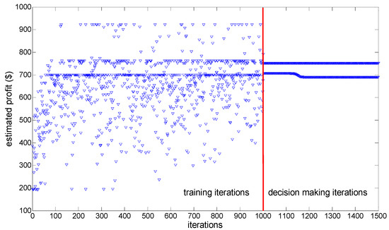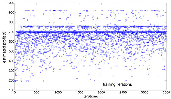 In TBRL-based EM modeling approaches [26,27,28,29,30,31,36], both the state and action sets should be assumed as discrete, otherwise the problem of “curse of dimensionality” will be caused so as to significantly hinder agents from improving their profits. However, according to Section 3.1 and [41], in day-ahead EM with many strategic WPPs, both () and () are within the continuous, bounded and closed sets (spaces). Therefore, a modified RL algorithm must be applied in day-ahead EM modeling for the study of strategic behaviors of WPPs.