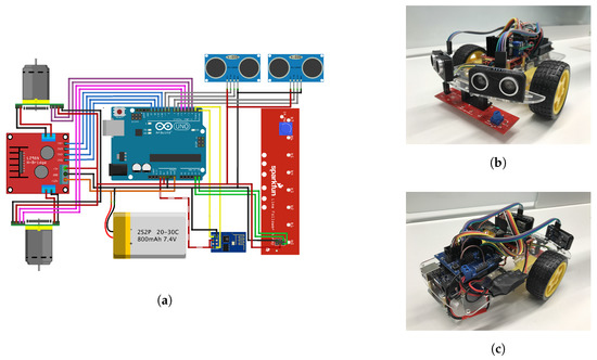 Robot prototype design: Electronic components and design of the robot connections (a); Details of the Pyxis Robot (b,c).