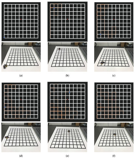 Robot experiment with . Snapshots captured every 200 steps. The orange traces correspond to the anti-pheromone level. (a) (initial position); (b) ; (c) ; (d) ; (e) ; (f) (final position, the robot is on target).