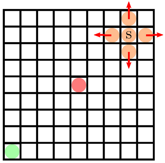 Schematic for the perturbed random walk on a lattice. Here a random walk starting at the bottom left corner (green dot) will wander through the lattice until the target (red dot at the center) is reached. At some cells s, the transition probabilities of the cell neighbors are perturbed (orange dots array).