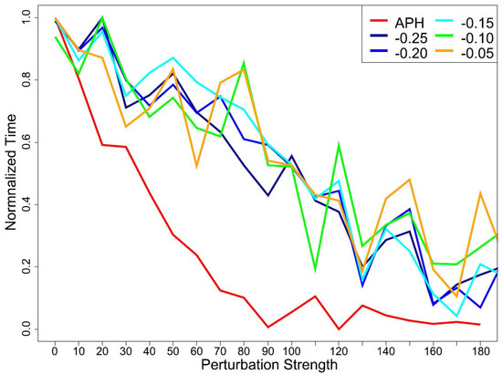 Normalized Arrival times for anti-pheromone (APH) and perturbed Markov model with different strength.