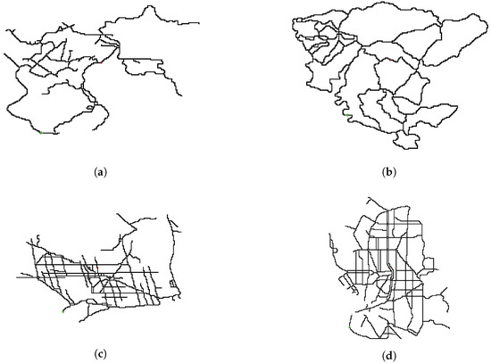 Topologies and spatial complexities for: (a) Gijón ; (b) Castellón ; (c) Barcelona ; and (d) Madrid .