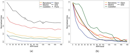Normalized arrival time means for different topologies and different values. (a) Times are first scaled with the city to grid area ratio and then normalized with the maximum and minimum values obtained from all topologies; (b) times are normalized with the maximum and minimum times from each topology