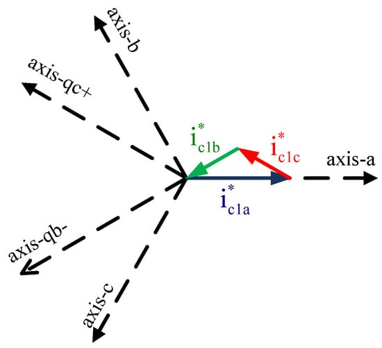 As a result, an injection of fundamental circulating current in one arm of the MMC phase leg would unavoidably couple with the other phases of the converter, if no further action is taken. To achieve a decoupled control, the main idea of this implementation is the injection of active current in the unbalanced phase and reactive currents in the balanced phases so that the average of the capacitor voltages is not shifted, and thus, the total average energy difference remains unaffected. In this example, since Phase-a is unbalanced, an active current (in phase with the voltage of Phase-a) should be applied as shown in Figure 4. The reactive currents of Phase-b and Phase-c could be combined to form a vector that is opposite the active vector of Phase-a, as shown in Figure 4. The magnitude of the vectors to be applied can be determined based on the law of cosines and basic trigonometry. Therefore, the amplitude of the vectors of Phase-b and Phase-c are -times smaller than the vector of Phase-a. In Figure 4, axis-qb-is denoted as the reactive axis of Phase-b in the anti-clockwise direction. Similarly, axis-qc+ is the reactive axis of Phase-c in the clockwise direction.