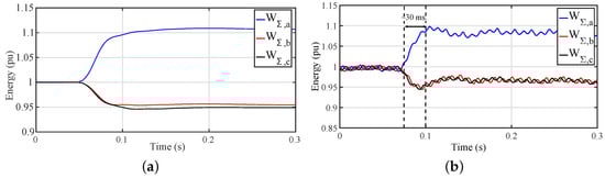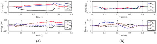 Moreover, similarly to the previous scenario, the internal balance of the converter and its ability to ride through the AC-fault without tripping is assessed at this point. Firstly, the waveforms of and when the energy controllers are deactivated are shown in Figure 16a. In this figure, it can be seen that the leg energy of Phase-b increases unacceptably, and by the end of the voltage sag, it reaches 1.15 pu. Furthermore, an inspection of the energy difference between the arms shows that an unbalance exists between the upper and lower arm.