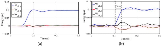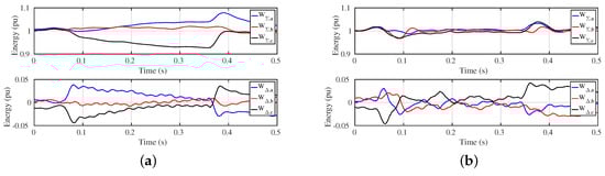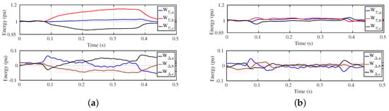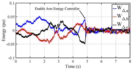 Figure 14b depicts and when the energy controllers are activated. The leg energy balancing controller manages to eliminate the energy differences between the converter legs and keep them equal at 1 pu. The arm energy controller exhibits an improved performance in comparison to the previous case, as it acts quickly after the initial transient, keeping the energy levels of the upper and lower arms of each phase equal.