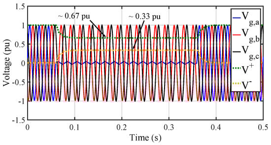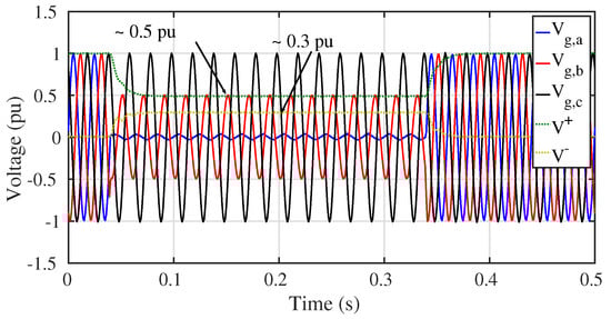 As can be observed, (8) contains the average terms and , as well as the oscillating terms , , and . The oscillating terms are the result of the presence of the negative sequence voltage component.