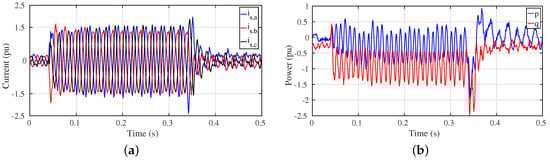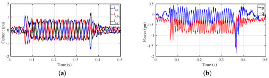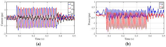 The positive sequence current droop controller is set again to , while the one for the negative sequence current is chosen to be . As a result, the required capacitive positive sequence current is again found to be approximately 0.6 pu, while the inductive negative sequence current required, according to (11), is 0.28 pu. The injected current waveforms are shown in Figure 15a. Note that in this case, the currents are increased due to the negative sequence injection, but remain inside their rated limits. It is also evident that during the sag, the MSI strategy results in unbalanced current injection. Figure 15b shows the instantaneous active and reactive powers. Due to the increased current injection, the power oscillations increased. This result can also be explained by (9).