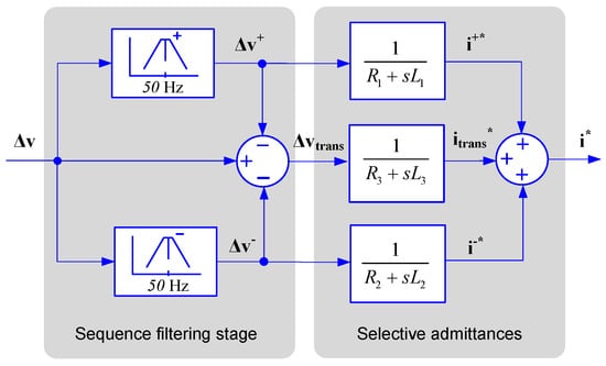 In Figure 2, L1 and R1 are the inductance and the damping resistance of the impedance for the positive-sequence voltage components at the fundamental frequency, while L2 and R2 are the ones for the negative-sequence signals at the fundamental frequency. The rest of the voltage components go through a third admittance branch (L3 and R3), which is named as transient admittance. Considering the possible delay of the filtering stages, this third branch will present a controlled impedance feature during transients. Therefore, the positive- and negative-sequence voltage support possess the same gain during the transient, which is determined by L3. In addition, the injection of harmonic currents is also determined by this transient admittance, although additional selective band-pass filters and corresponding harmonic impedances might be also implemented. Above all, the current reference generated by the virtual admittance block of Figure 2 results from the sum of three components, that is: