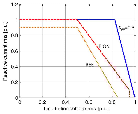 Based on the knowledge on traditional power systems, a typical value for the output impedance of a synchronous generator, Xpu, can be chosen around 0.3 [29]. Then, according to Equation (20), the resulting proportional gain, kq, is calculated to be 5.77. Figure 3 shows the voltage support characteristics when Xpu = 0.3 compared with the E.ON and REE grid codes, which set a minimum current that should be provided by a generation unit during the fault. It can be observed in this figure that the resulting voltage support characteristic is above the requirements of both grid codes.