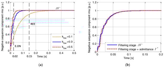 Figure 4b shows how the dynamics of the positive- and negative-sequence current injection during asymmetrical faults is mainly determined by the sequence filtering stage, since the admittance time response is very fast and does not add almost any delay.