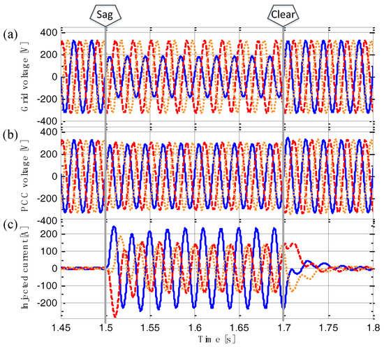 The event considered in this simulation test is a 0.43 p.u. of voltage sag in one of the phases of the ac source, and it lasts for 200 ms. According to the aforementioned grid codes, the power converter should remain connected to the grid under such unbalanced voltage drop and the voltage support should be also triggered.