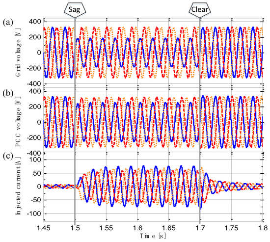 Three-phase balanced faults are usually considered for stating the low-voltage ride-through (LVRT) requirements in most of the grid codes; however, asymmetrical faults are the most common faults in electrical grids [18,19]. Due to an asymmetrical grid fault, the voltages at the point of common coupling (PCC) will sag and become unbalanced, and may cause the trip of the power converters and the loads connected to the PCC. Sophisticated ride-through abilities for power converters can be enabled to prevent tripping of renewable generation units under fault conditions [20,21], the lack of contribution of negative-sequence current during asymmetrical faults motivates further improvement in the control design [22].