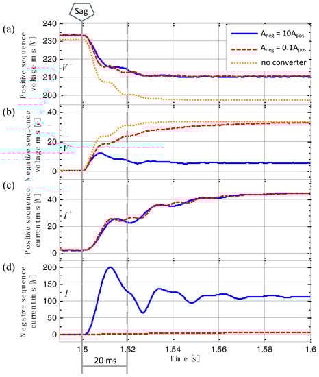 Figure 8a shows that the positive-sequence voltage is properly supported by the SPC-based power converter with virtual admittance. The drop of the positive-sequence voltage component at the PCC is 8.5% when the power converter is activated, in comparison with 14.1% when the power converter is blocked. Figure 8b demonstrates a significant compensation of the unbalanced effect. When Aneg = 10, the per-unit rms voltage of the negative-sequence at the PCC during the fault is only 2.35%, a value much smaller than 14.6%, which is the per-unit rms voltage of the negative-sequence component of the voltage at the main grid. Figure 8d shows that the rms value of the negative-sequence current injected during the unbalanced fault can be simply adjusted by changing the values for the negative-sequence admittance, i.e., Aneg. Figure 8 also shows that the reaction of the converter in presence of the unbalanced fault is less than 20 ms and gets settled within 100 ms, which meets the grid codes requirements.
