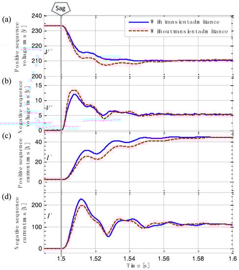 Effect of the transient admittance branch under an asymmetrical grid fault: (a) positive sequence PCC voltage rms; (b) negative sequence PCC voltage rms; (c) positive sequence current rms; and (d) negative sequence current rms.
