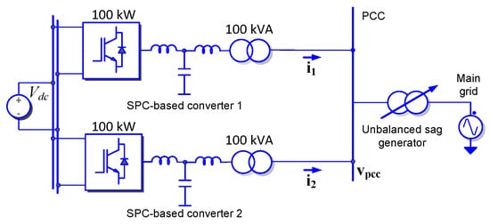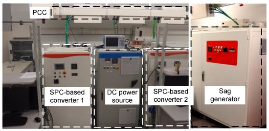 Figure 12 shows the experimental setup for asymmetrical grid fault tests, where two 100 kW two-level three-phase power converters with the same specifications are connected in parallel and to the utility grid through a sag generator. The setup is pictured in Figure 13. A dc power source supplies both converters. The parameters for the SPC-based power converters are the same as the ones used in simulation, shown in Table 1. The event considered in the experiments is the same with the simulation tests, namely, a voltage sag of 0.43 p.u. in one of the phases of the ac grid.