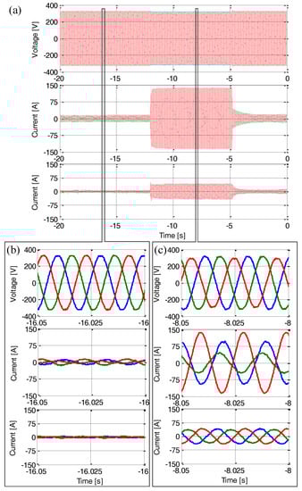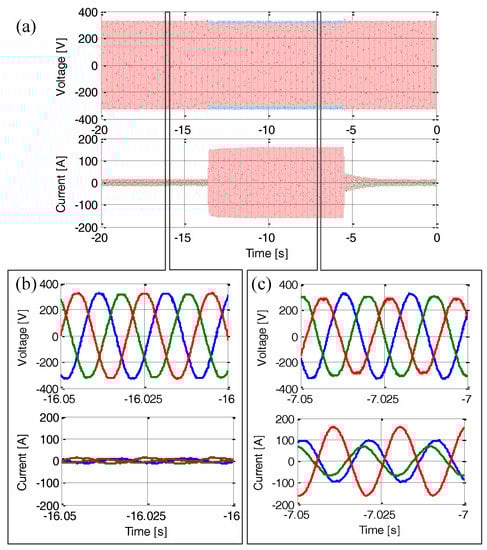 In a first experiment, only one of the two converters is connected, and Apos, Aneg, and Atrans are set to 1, 10 and 1, respectively. The voltage and current waveforms at the PCC during normal working and under fault conditions are shown in Figure 14. In this experimental test, the voltage sag is started and ended manually, which lasts for 8 s.