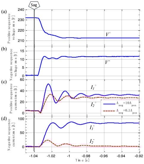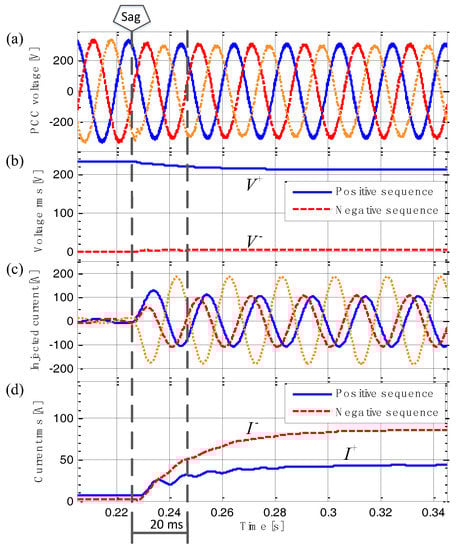 The rms value for the positive- and negative-sequence components of the voltage at the PCC and the injected current, calculated by and , are shown in Figure 8.