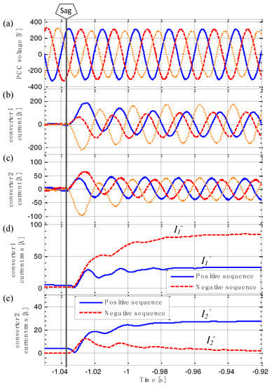 The recorded data from the oscilloscope are plotted in Figure 15 to check the power converter dynamics and a quantitative evaluation of the injected positive- and negative-sequence currents. The positive- and negative-sequence components of the PCC voltage are also calculated.