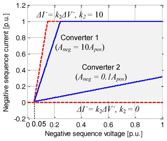 One example of the requirement of the negative-sequence current injection can be found in the German grid codes VDE-AR-N 4120 [28], where it is required a proportional gain k2 between the magnitude of the negative-sequence current and the negative-sequence voltage given by: