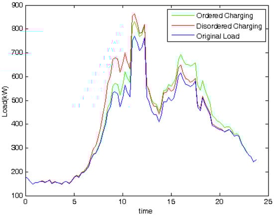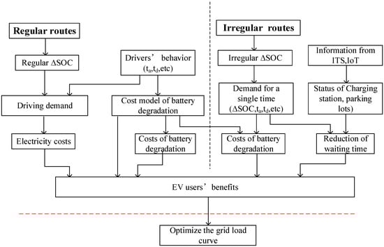 For regular routes, the costs of battery capacity degradation and electricity costs are regarded as the users’ benefits. The cost of battery capacity degradation is calculated by the proposed cost model of battery degradation based on the experiment data, and the electricity cost is calculated by the Time of Use (TOU) tariff for EVs in Beijing. After managing the EVs’ mean SOC, charging SOC range (ΔSOC), and charging time slot to ensure that EV users’ can achieve their lowest costs, the grid load curve is then optimized by an artificial fish swarm algorithm in the time horizon restricted by the EV users’ benefits. For irregular routes, the waiting time and costs of battery degradation are considered as main benefits of EV users since the destinations are usually busy areas, such as shopping malls. To reduce users’ waiting times for charging, queuing theory is adopted. Similarly, a cost model of battery degradation is applied to manage the EVs’ SOC range to reduce the costs of battery degradation. Meanwhile, limiting the amount of charging electricity also contributes to reducing the waiting time.