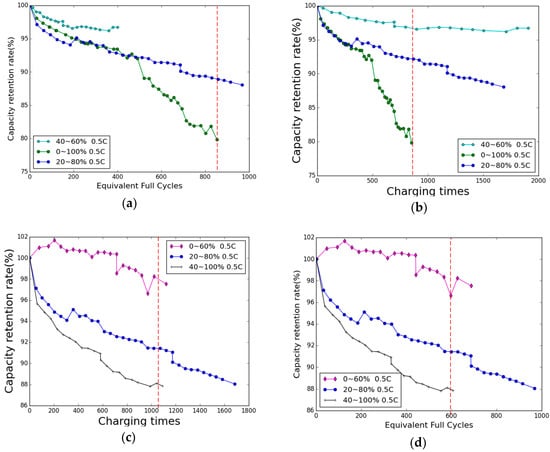 (a) Battery capacity retention rate versus equivalent full cycles of batteries cycling at 50% mean SOC; (b) battery capacity retention rate versus charging times of batteries cycling at 50% mean SOC; (c) battery capacity retention rate versus equivalent full cycles of batteries cycling at 60% ΔSOC; and (d) battery capacity retention rate versus number of charging times of batteries cycling at 60% ΔSOC.