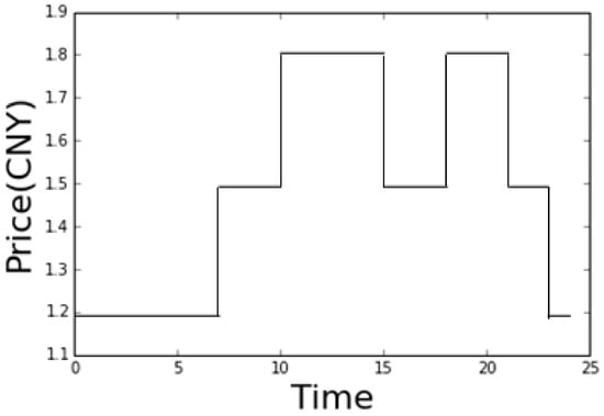In this paper, we adopt the Beijing peak-valley TOU charging price as an example for simulation results. The details are shown in Figure 3 and Equation (11):