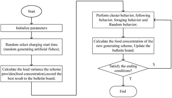 where is charging start time of an EV, denotes an EV’s arrival time, and indicates the departure time. The first two constraints restrict the charging time horizon, and the third constraint is to ensure that EVs always keep the SOC over 10% for unpredictable situations. The flowchart of AFSA is shown in Figure 4 and the following are the procedures: