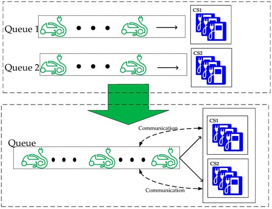 For irregular routes, especially those in busy areas, waiting time is another primary consideration of EV users, since the time of trips for shopping or emergencies are always limited. The queuing theory is adopted to solve this problem. The queuing model for charging stations are built to analyze their status and calculate the waiting time for EV drivers. When an EV enters the area, and begins to choose a charging station, the driver could get information, such as the waiting time of nearby charging stations from communication devices and make a choice. Consequently, queues for several charging stations in the area are combined into one queue, virtually. The method is shown in Figure 5.